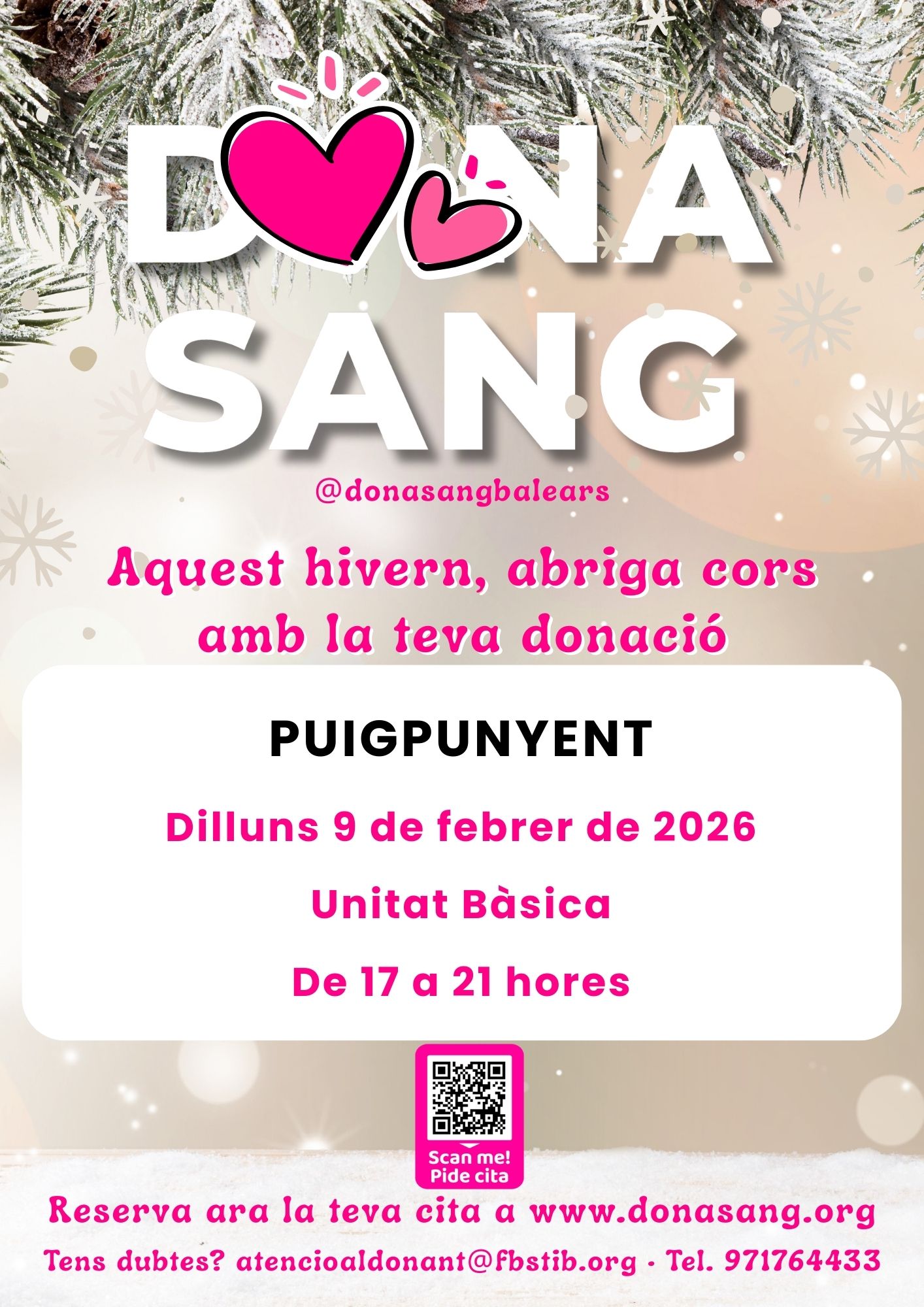 El pròxim dilluns, 9 de febrer, tenim totes i tots la oportunitat d'ajudar al Banc de Sang i Teixits de les Illes Balears amb una donació de sang de 17:00 a 21:00 a la Unitat Bàsica de Salut de Puigpunyent al c/ Sa Travessia.