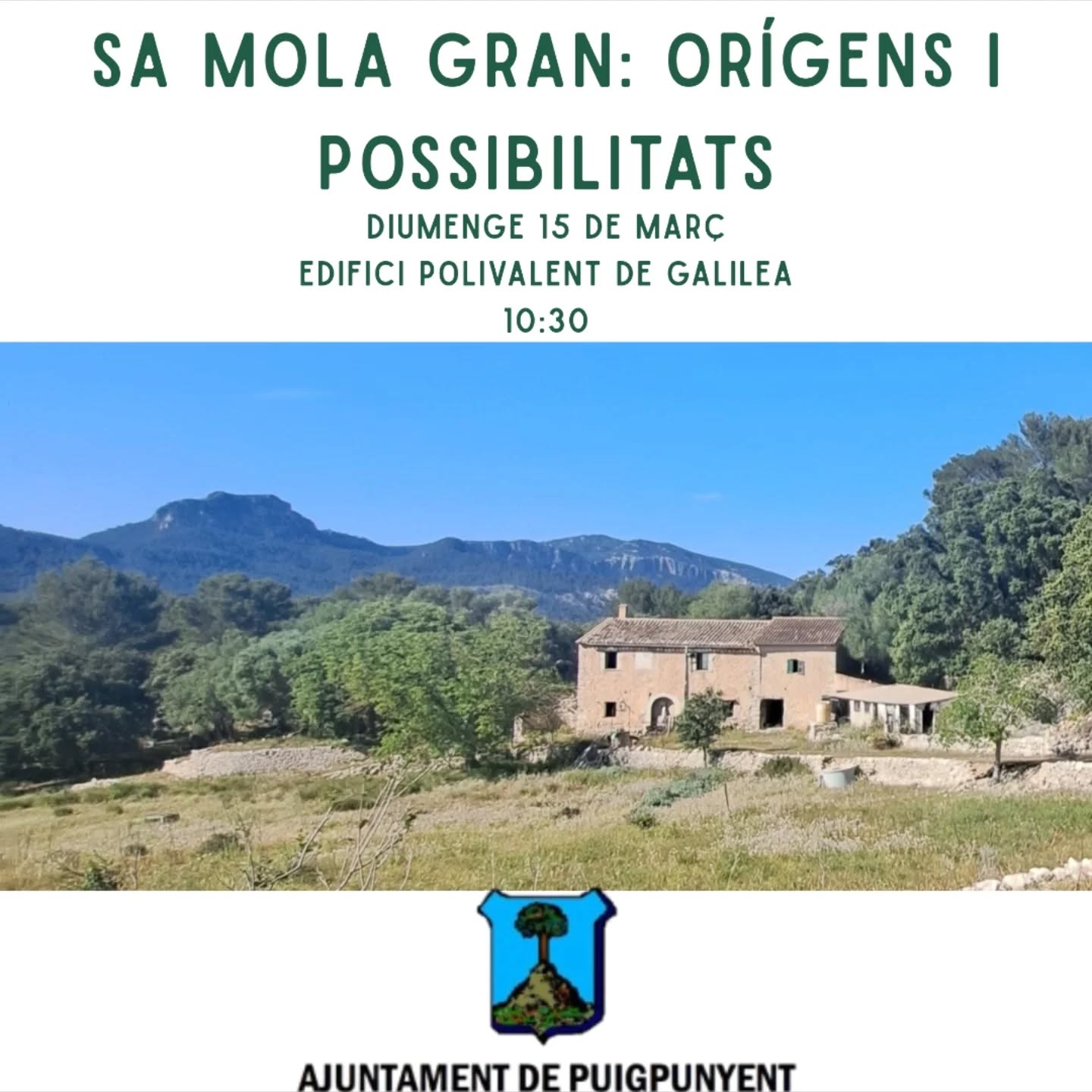 Celebrarem una trobada oberta a tota la ciutadania per a donar a conèixer i parlar sobre Sa Mola Gran. L'historiador, Tomàs Vibot, explicarà l'estudi de camp realitzat "Sa Mola Gran. Història, patrimoni i memòria". Tot seguit, es debatrà sobre allò que ens agradaria que fos Sa Mola Gran.