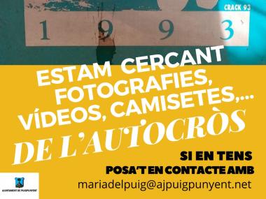 Estam cercant qualsevol tipus de material/element (camisetes, fotografies, vehicles, dissenys, gorres,...) relacionat amb l'Autocròs que es realitzava al nostre municipi.