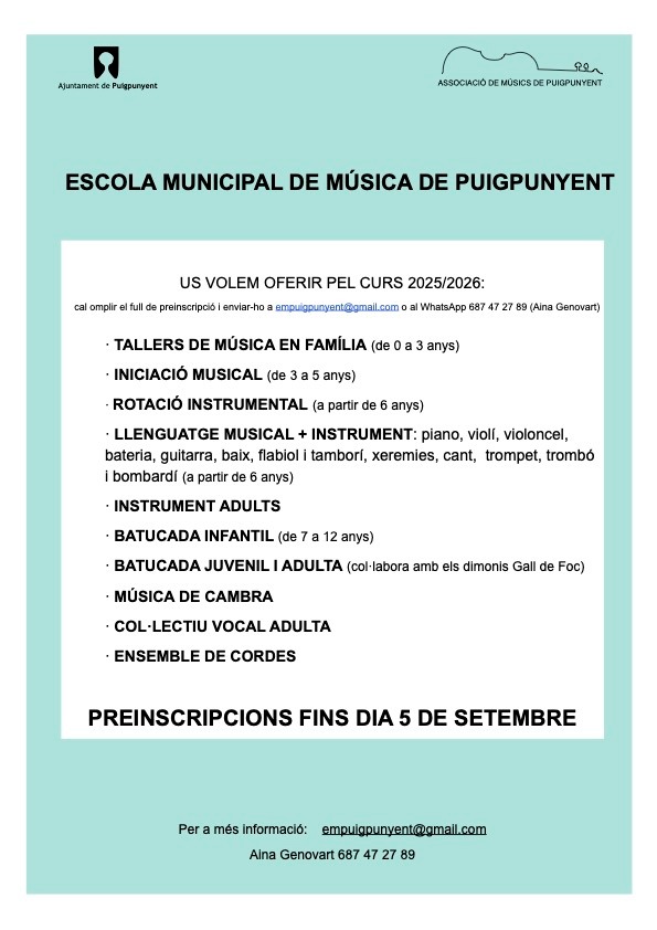 Un any més tornem a oferir-vos tota la informació per al curs 25/26 de l'escola municipal de música de Puigpunyent.