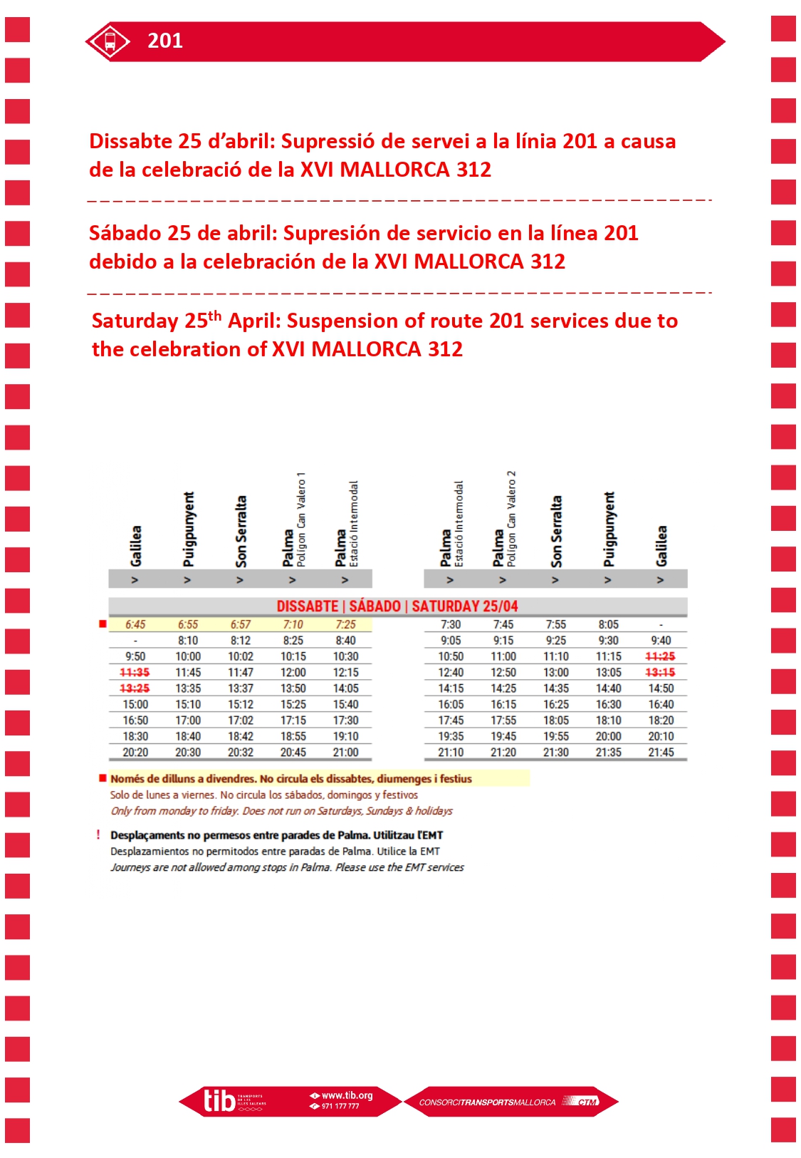 Línies afectades: 201 (Palma-Galilea). Altres afectacions: canvi de parada a Puigpunyent.