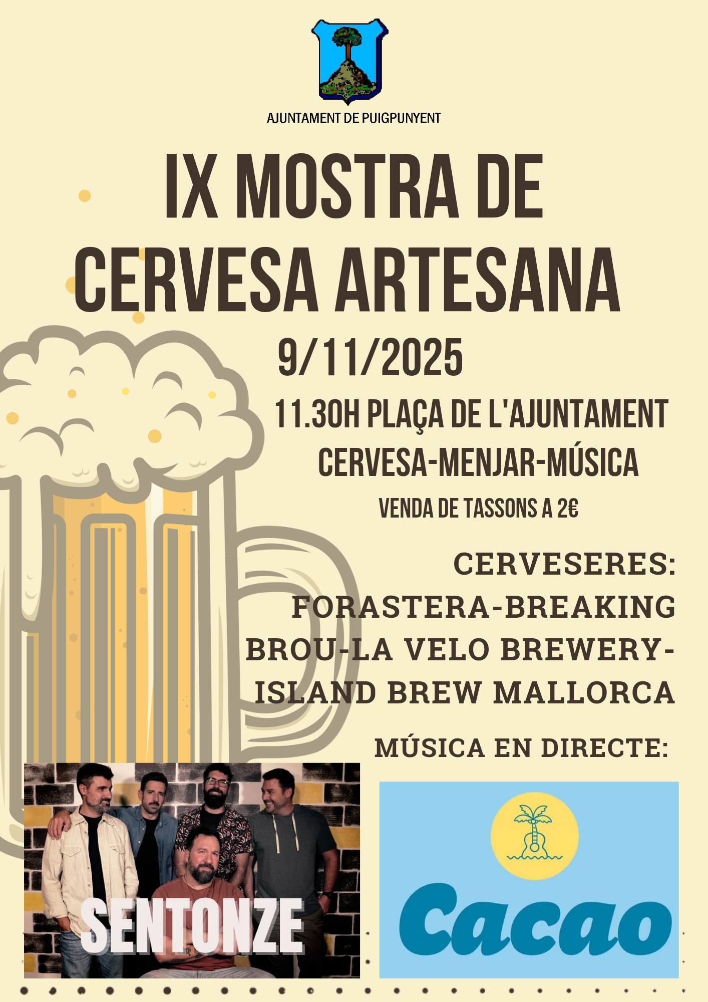 La novena edició de mostra de Cervesa Artesana de Puigpunyent ja arriba! Ja ens veurem el diumenge 9 de novembre a partir de les 11:30 a la plaça de l'Ajuntament.